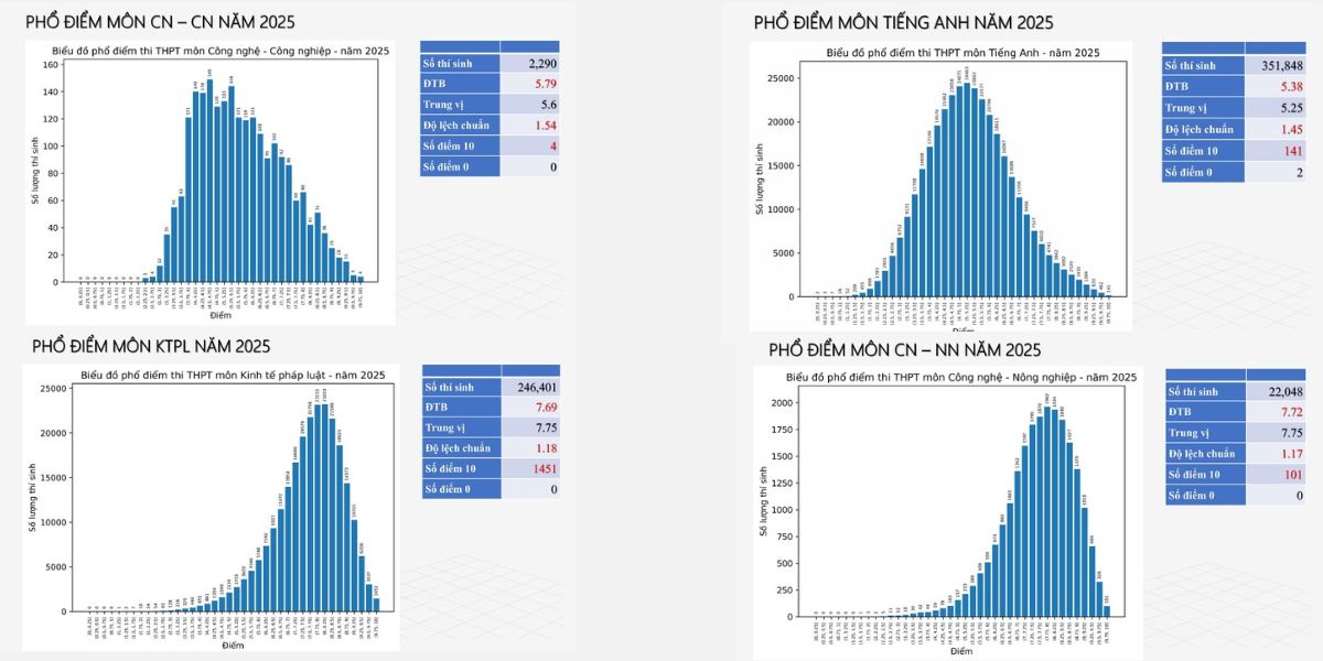 Trong kỳ thi THPT Quốc gia 2025, môn Công nghệ – Công nghiệp lần đầu tiên được đưa vào kỳ thi có điểm trung bình 5,79, với 4 điểm 10 và không có bài bị điểm liệt, cho thấy phổ điểm tương đối cân bằng và phân hóa nhẹ. Môn Kinh tế và Pháp luật đạt điểm trung bình cao 7,69, gần 1.450 thí sinh đạt điểm 10 và hơn 78% bài thi đạt từ 7 điểm trở lên, phản ánh đề thi phù hợp và khả năng tiếp thu tốt của học sinh. Môn Tiếng Anh có gần 353.000 thí sinh dự thi, điểm trung bình đạt 5,38, với 141 bài đạt điểm 10 và phổ điểm trải đều quanh mức trung vị, thể hiện mức độ phân hóa hợp lý.