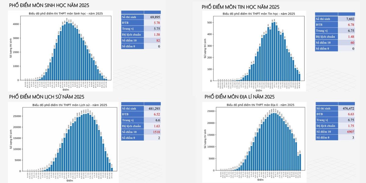 Trong kỳ thi THPT Quốc gia 2025, môn Sinh học có điểm trung bình 5,78, giảm nhẹ so với năm trước, với hơn 80 điểm 10 và không có bài thi dưới 1 điểm, cho thấy phổ điểm trải rộng và phân hóa vừa phải. Môn Lịch sử đạt trung bình 6,52, có hơn 1.500 điểm 10 và khoảng 18% thí sinh dưới trung bình, phản ánh đề thi vừa sức nhưng vẫn đảm bảo khả năng phân loại. Môn Địa lý có điểm trung bình 6,63, số lượng điểm 10 cao gần 7.000 bài, tuy vẫn có một vài bài điểm liệt – cho thấy phổ điểm rộng và cơ hội nổi bật cho học sinh học tốt. Môn Tin học lần đầu tiên được đưa vào kỳ thi, có điểm trung bình 6,78, không có bài điểm 0 và có 60 điểm 10, phản ánh đề thi phù hợp và đánh giá đúng năng lực thí sinh.
