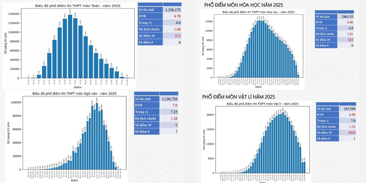 Trong kỳ thi THPT Quốc gia 2025, môn Toán có điểm trung bình thấp (4,78), phổ điểm lệch trái rõ rệt dù vẫn có hơn 500 điểm 10 – cho thấy đề thi khó và mang tính phân loại cao. Môn Ngữ Văn ổn định với điểm trung bình khoảng 7, không có điểm 10 nhưng phổ điểm trải đều, phù hợp để xét tốt nghiệp. Môn Vật Lý nổi bật với điểm trung bình gần 7, số lượng điểm 10 cao và hầu như không có điểm liệt, phản ánh đề thi an toàn, dễ đạt điểm cao. Môn Hóa học giữ mức trung bình trên 6, có nhiều điểm 10 nhưng tỷ lệ bài dưới trung bình vẫn khá cao, cho thấy mức độ phân hóa rõ nét.