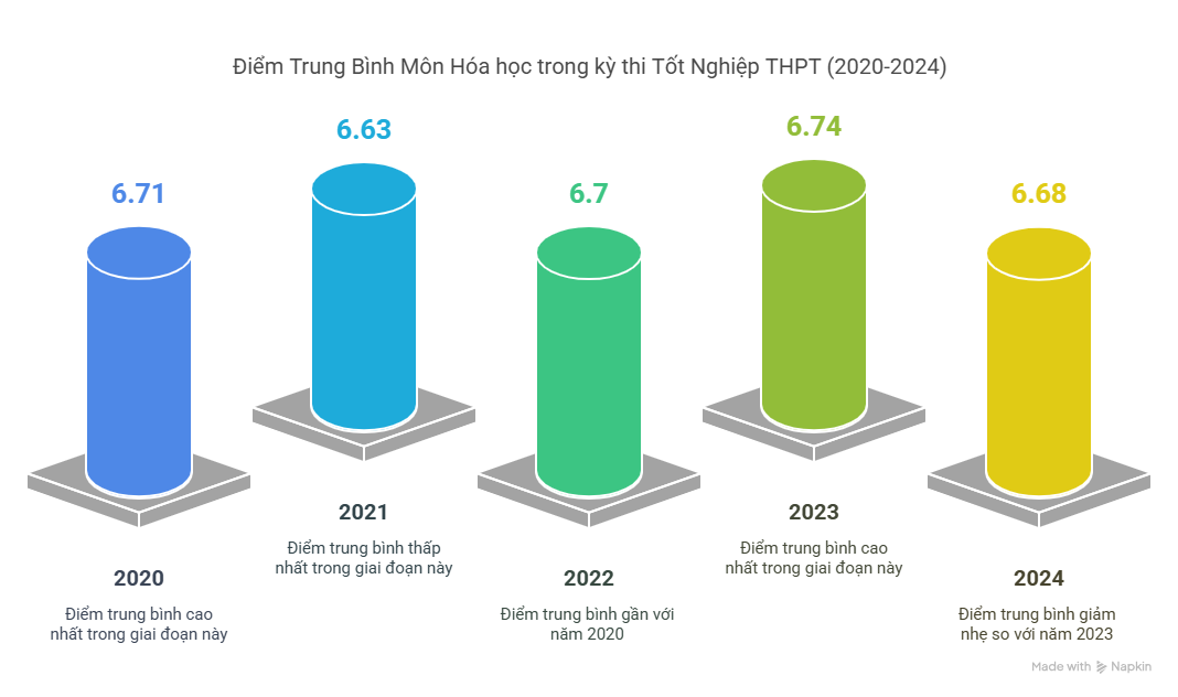 Phổ điểm THPT môn Hoá học khá ổn định từ 2020-2024, điểm trung bình từ 6,3–6,8 điểm. Đề thường bám sát chương trình, nhưng vẫn có nhiều câu phân loại cao ở phần vô cơ và hữu cơ.