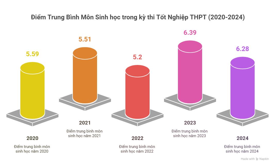Phổ điểm THPT môn Sinh học dao động từ 5.5–6.2 điểm qua các năm, thấp hơn các môn tự nhiên khác. Đề thi thiên về tư duy phân tích và hiểu bản chất sinh học, khiến nhiều học sinh gặp khó khăn.