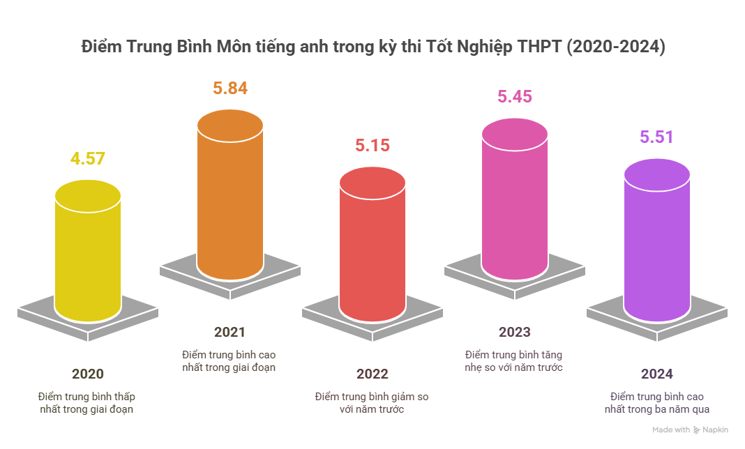 Phổ điểm THPT môn Tiếng Anh luôn là thử thách, các năm 2020–2022 điểm trung bình dưới 5. Từ 2023 tăng lên khoảng 5,6 nhờ đổi mới cách dạy và tăng cường kỹ năng thực tế.