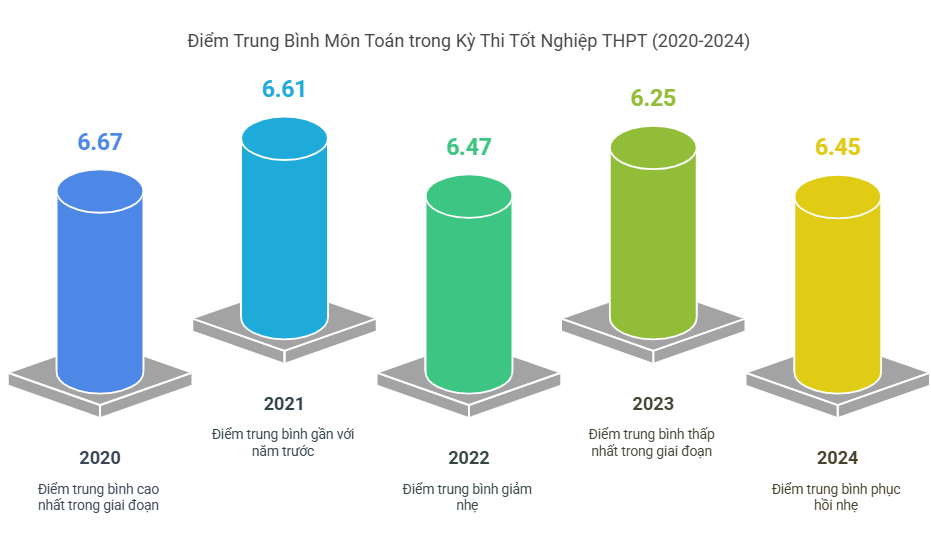 Phổ điểm THPT môn Toán từ 2020–2024 dao động từ 5 đến 7 điểm. Năm 2021–2022 điểm trung bình khoảng 6.4, đến 2023 tăng lên gần 6.7 cho thấy học sinh đã quen hơn với dạng đề trắc nghiệm tích hợp tư duy.
