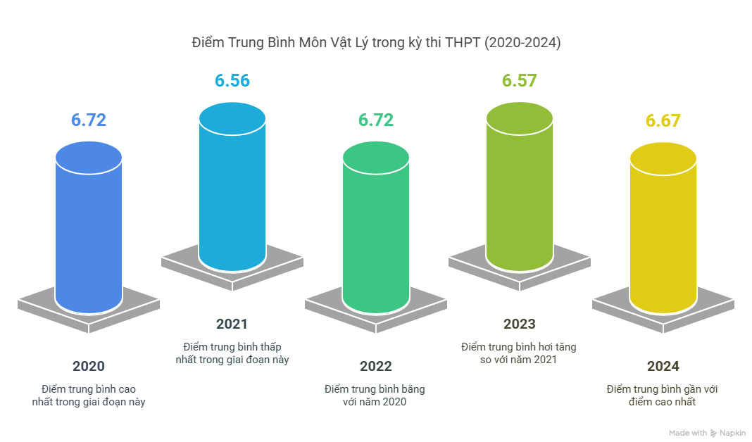 Phổ điểm THPT môn Vật lý qua các năm cho thấy sự phân hóa rõ rệt, điểm trung bình trong khoảng 6.2–7.0. Tuy nhiên, số thí sinh dưới trung bình vẫn nhiều do môn này đòi hỏi tư duy logic và kỹ năng vận dụng công thức.