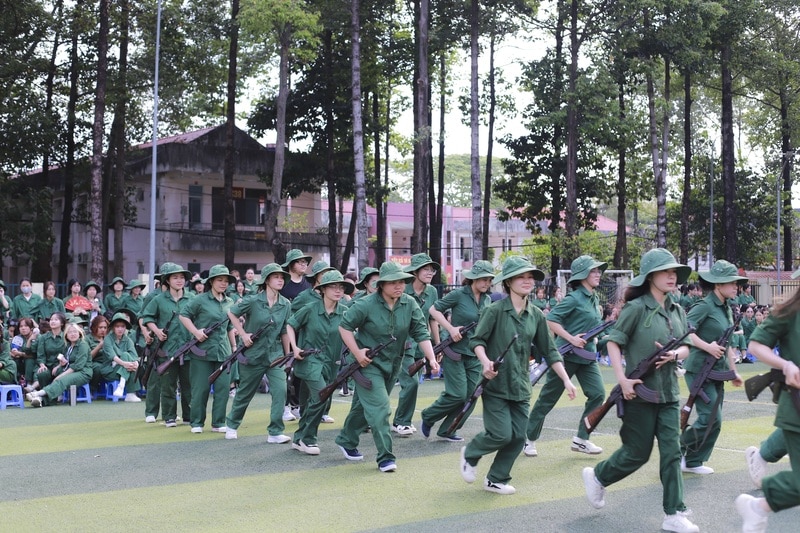 Các sinh viên rèn luyện tác phong kỷ luật, tinh thần tập thể trong môi trường quân đội