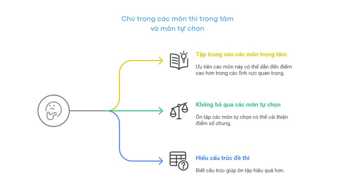 Mỗi khối thi sẽ có những môn trọng tâm khác nhau. Hãy dành sự ưu tiên ôn tập cho những môn này để tối đa hóa cơ hội đạt điểm cao. Đồng thời, đừng bỏ qua các môn tự chọn, vì đây cũng là những môn có thể giúp bạn cải thiện điểm số chung.