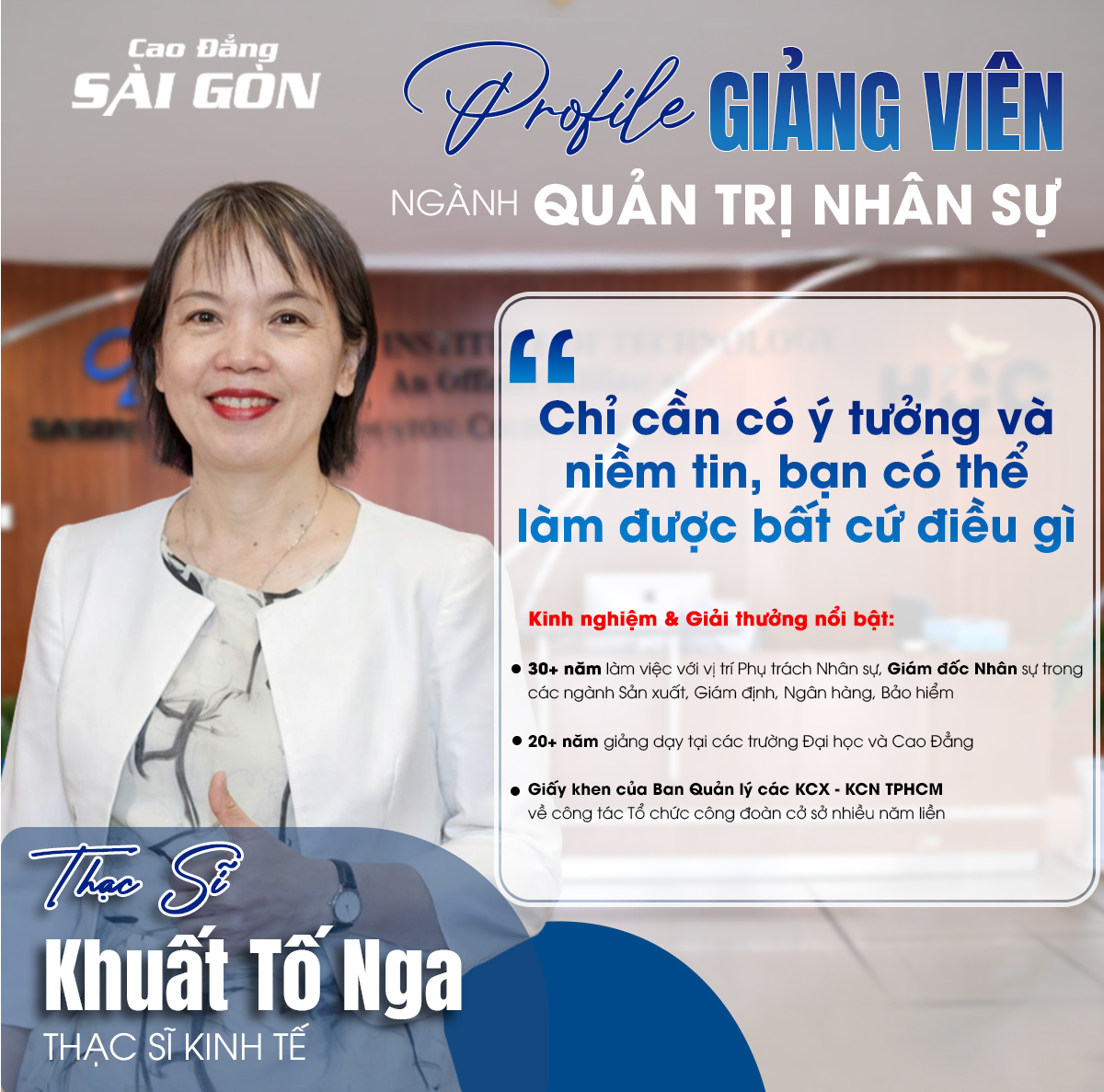 Với kinh nghiệm dày dặn, tinh thần trách nhiệm và tâm huyết với nghề, cô Khuất Tố Nga đã và đang góp phần quan trọng trong việc nâng cao chất lượng đào tạo ngành Quản trị nhân sự tại Trường Cao đẳng Sài Gòn.
