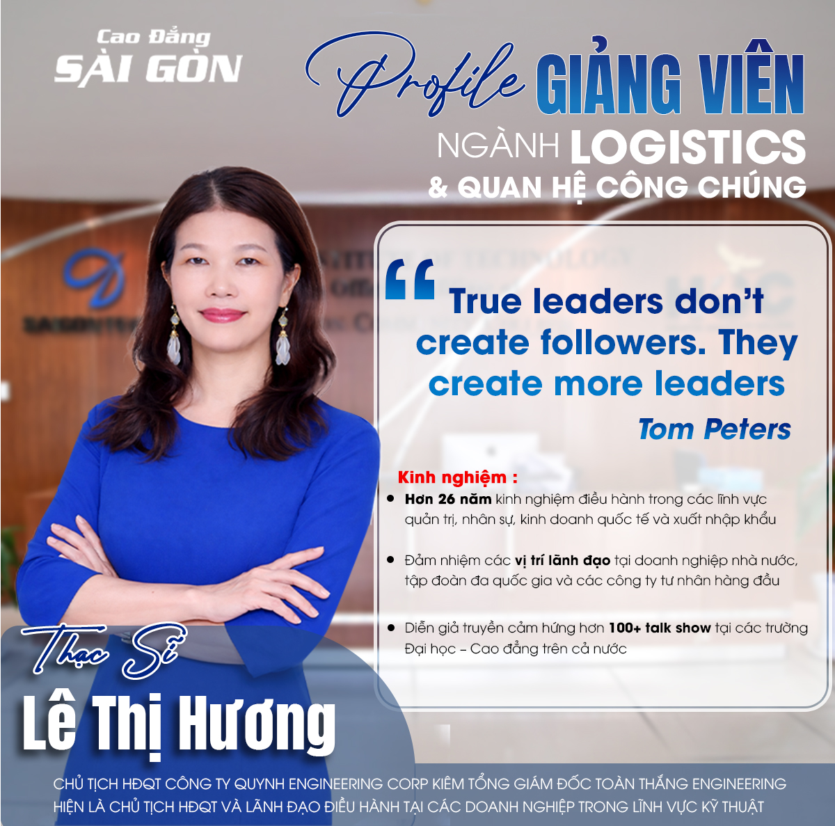 Trong hành trình đào tạo nguồn nhân lực chất lượng cao cho xã hội, đội ngũ giảng viên chính là yếu tố cốt lõi tạo nên giá trị khác biệt của Trường Cao đẳng Sài Gòn. Một trong những gương mặt tiêu biểu, để lại nhiều dấu ấn sâu sắc trong lòng sinh viên chính là cô Lê Thị Hương – giảng viên ngành Logistics và ngành Quan hệ công chúng. Không chỉ là một nhà giáo tận tâm mà còn là nhà lãnh đạo doanh nghiệp dày dạn kinh nghiệm, mang đến cho sinh viên góc nhìn thực tiễn, hiện đại và đầy cảm hứng.