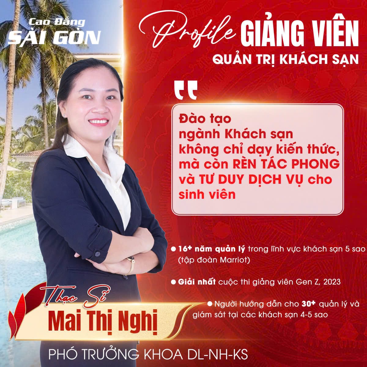 Thạc sĩ Mai Thị Nghị hiện đang đảm nhiệm vị trí Phó Trưởng khoa Du lịch – Nhà hàng – Khách sạn tại Trường Cao đẳng Sài Gòn. Với vai trò là giảng viên trực tiếp giảng dạy ngành Quản trị Khách sạn, cô không chỉ truyền đạt kiến thức chuyên môn mà còn là cầu nối với doanh nghiệp, giúp sinh viên tiếp cận tư duy nghề nghiệp thực tế, sát với môi trường doanh nghiệp.