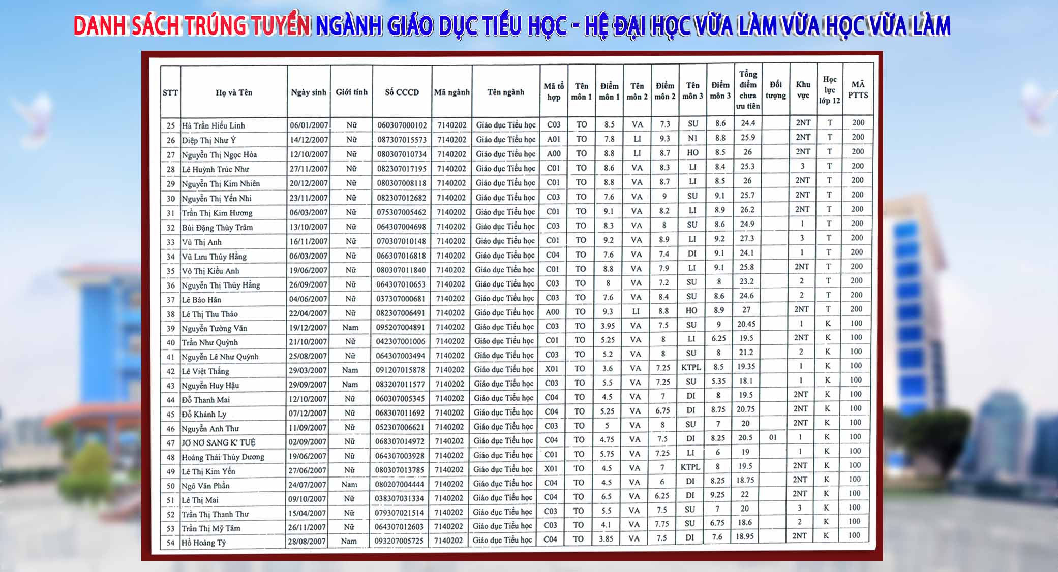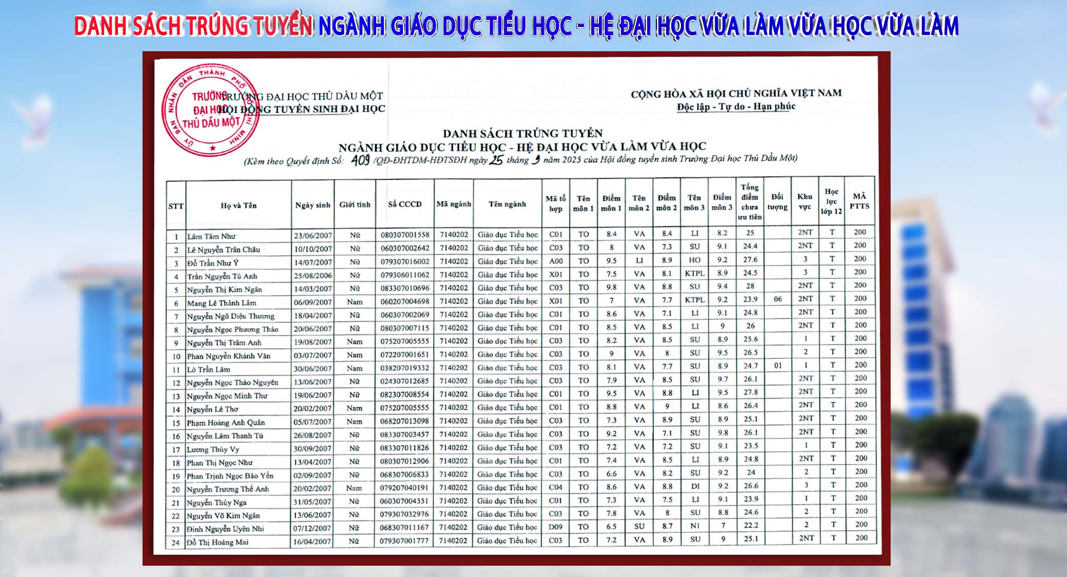 Danh sách chi tiết thí sinh trúng tuyển hệ vừa làm vừa học đã được ban hành kèm theo Quyết định của Hội đồng tuyển sinh Trường Đại học Thủ Dầu Một. Đây là kết quả chính thức cho đợt tuyển sinh ngành Giáo dục Tiểu học năm 2025.