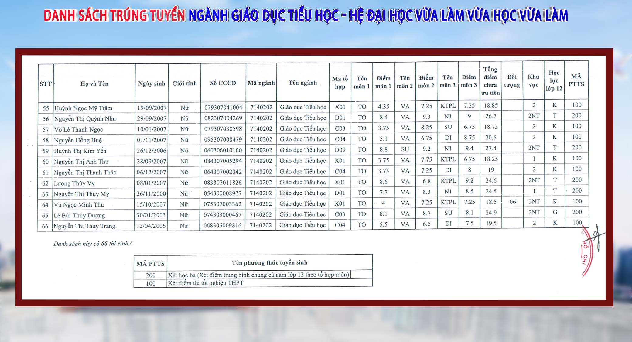 Danh sách thí sinh trúng tuyển ngành Giáo dục tiểu học hệ ĐH VHVL