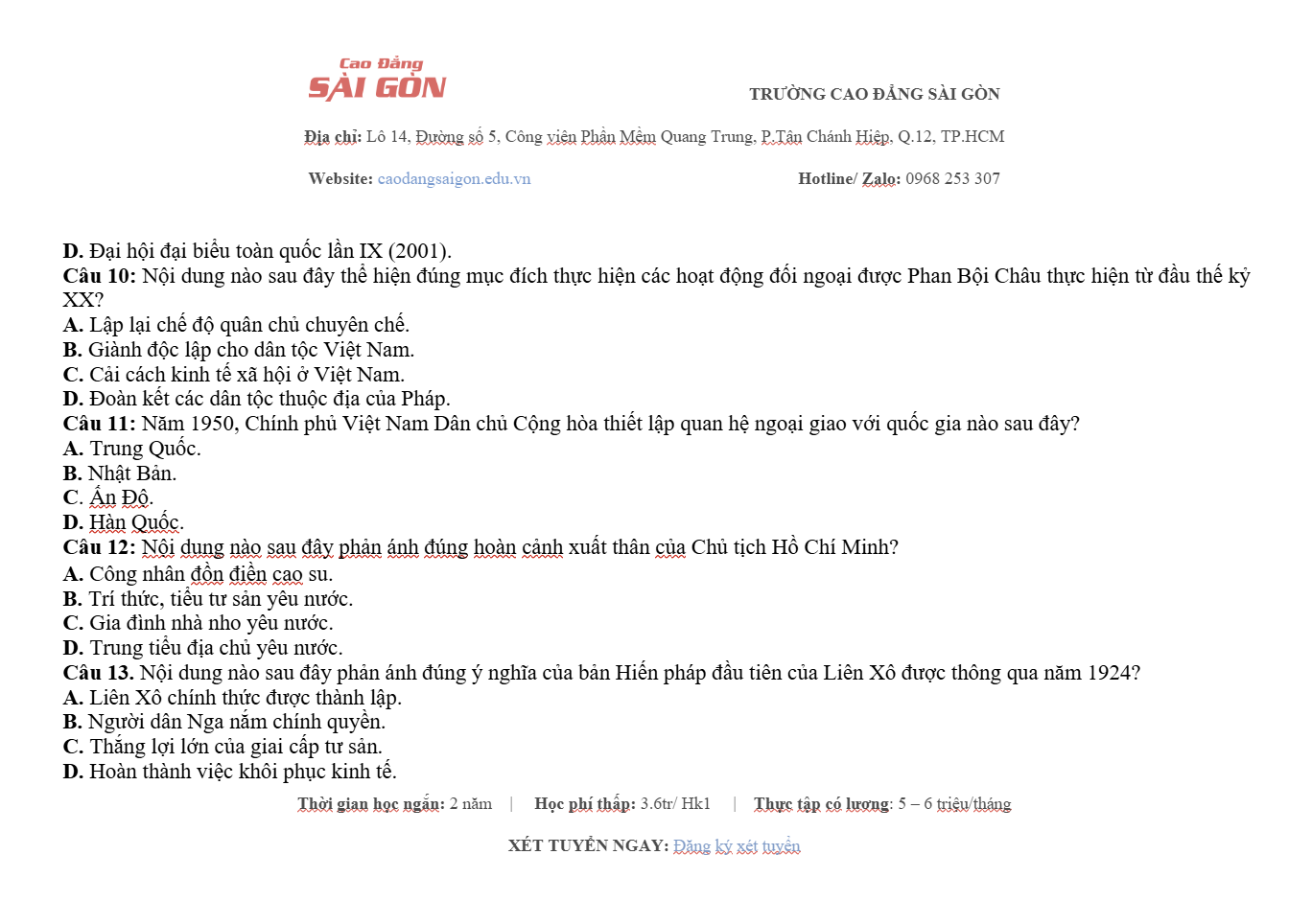 Trường Cao đẳng Sài Gòn cập nhật mới nhất đề thi thử tốt nghiệp THPT 2026 môn sử (có đáp án) của Sở Giáo dục và Đào Tạo. Hỗ trợ các em học sinh ôn thi sử THPT Quốc gia 2026 đạt hiệu quả cao.