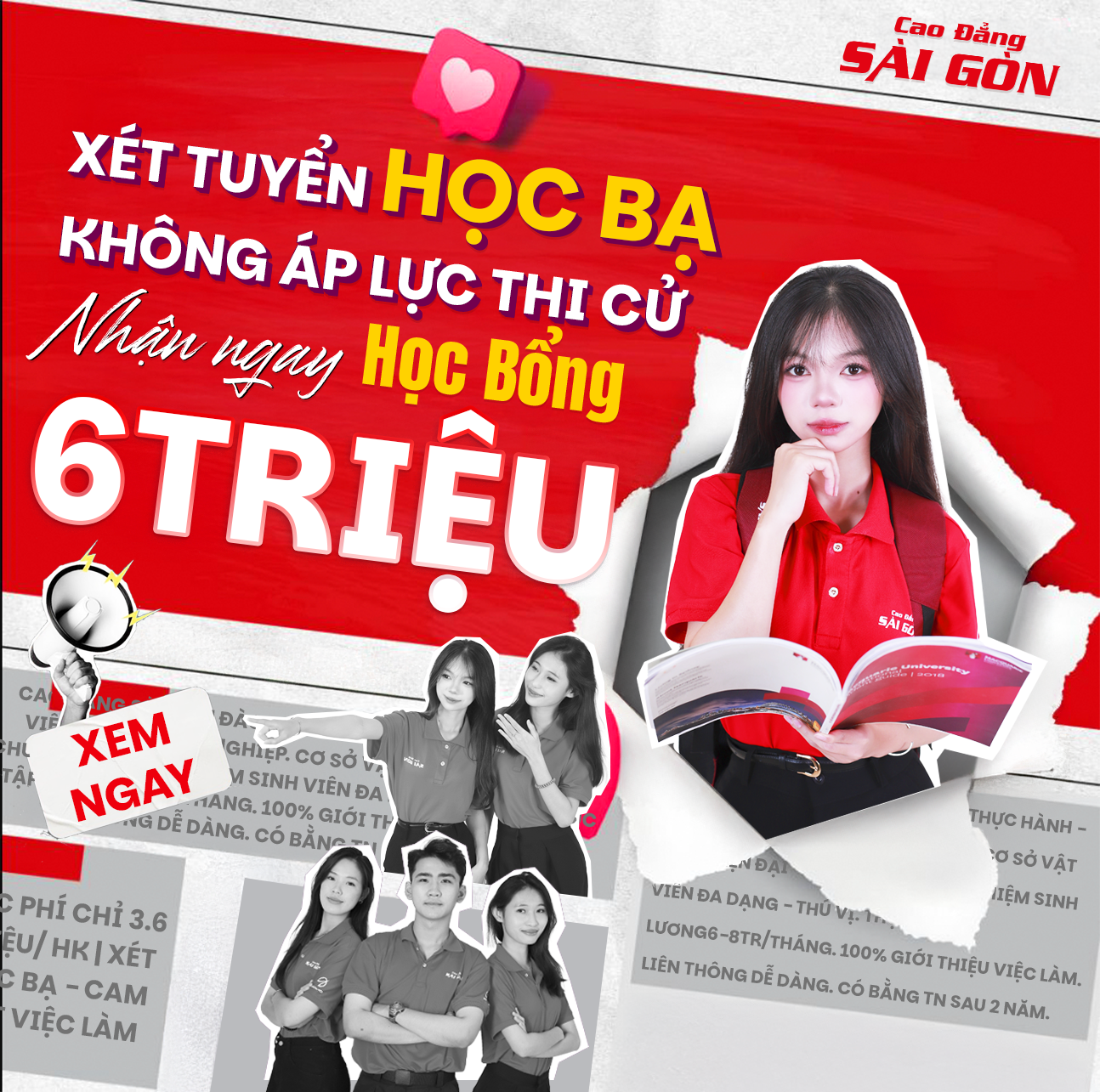Đặc biệt, Nhà trường hiện đang triển khai chương trình học bổng 6 triệu (chỉ còn 3,6 triệu đồng/HK1) dành cho tân sinh viên khi nhập học tại trường trong năm học 2025 – 2026.