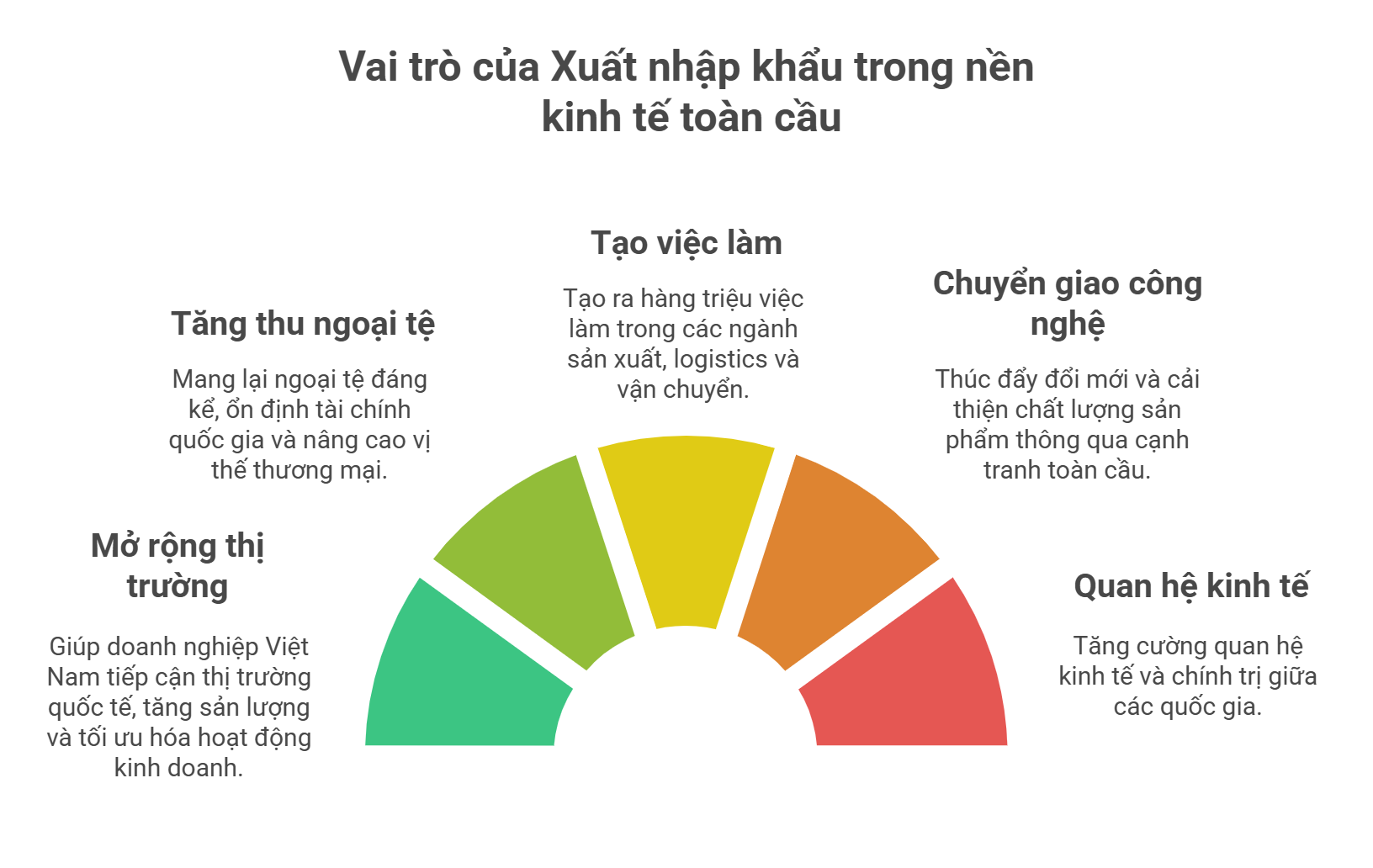 Tăng cường mối quan hệ kinh tế – chính trị giữa các quốc gia: Xuất nhập khẩu không chỉ là hoạt động thương mại, mà còn là công cụ kết nối và xây dựng quan hệ đối tác chiến lược giữa các nước.