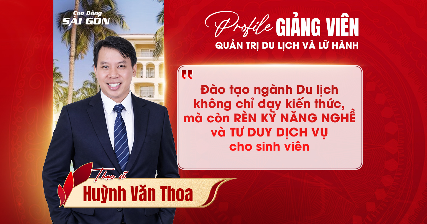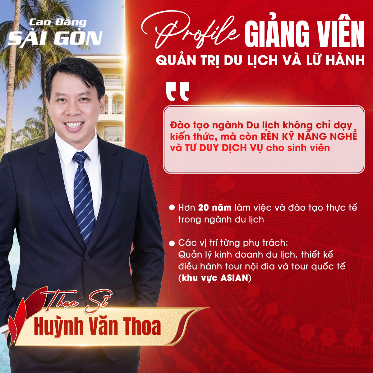 Thầy Huỳnh Văn Thoa hiện đang là giảng viên Khoa Du lịch, trực tiếp giảng dạy ngành Quản trị Du lịch và Lữ hành tại Trường Cao đẳng Sài Gòn. Thầy đã có hơn 20 năm làm việc và đào tạo thực tế trong lĩnh vực du lịch với nhiều vị trí khác nhau như: