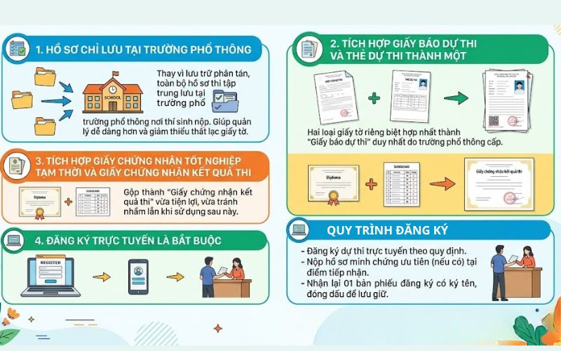 1. Hồ sơ chỉ lưu tại trường phổ thông Thay vì lưu trữ phân tán như trước, toàn bộ hồ sơ thi THPT quốc gia được tập trung lưu tại chính trường phổ thông nơi thí sinh nộp hồ sơ. Điều này giúp quản lý dễ dàng hơn và giảm thiểu thất lạc giấy tờ.
