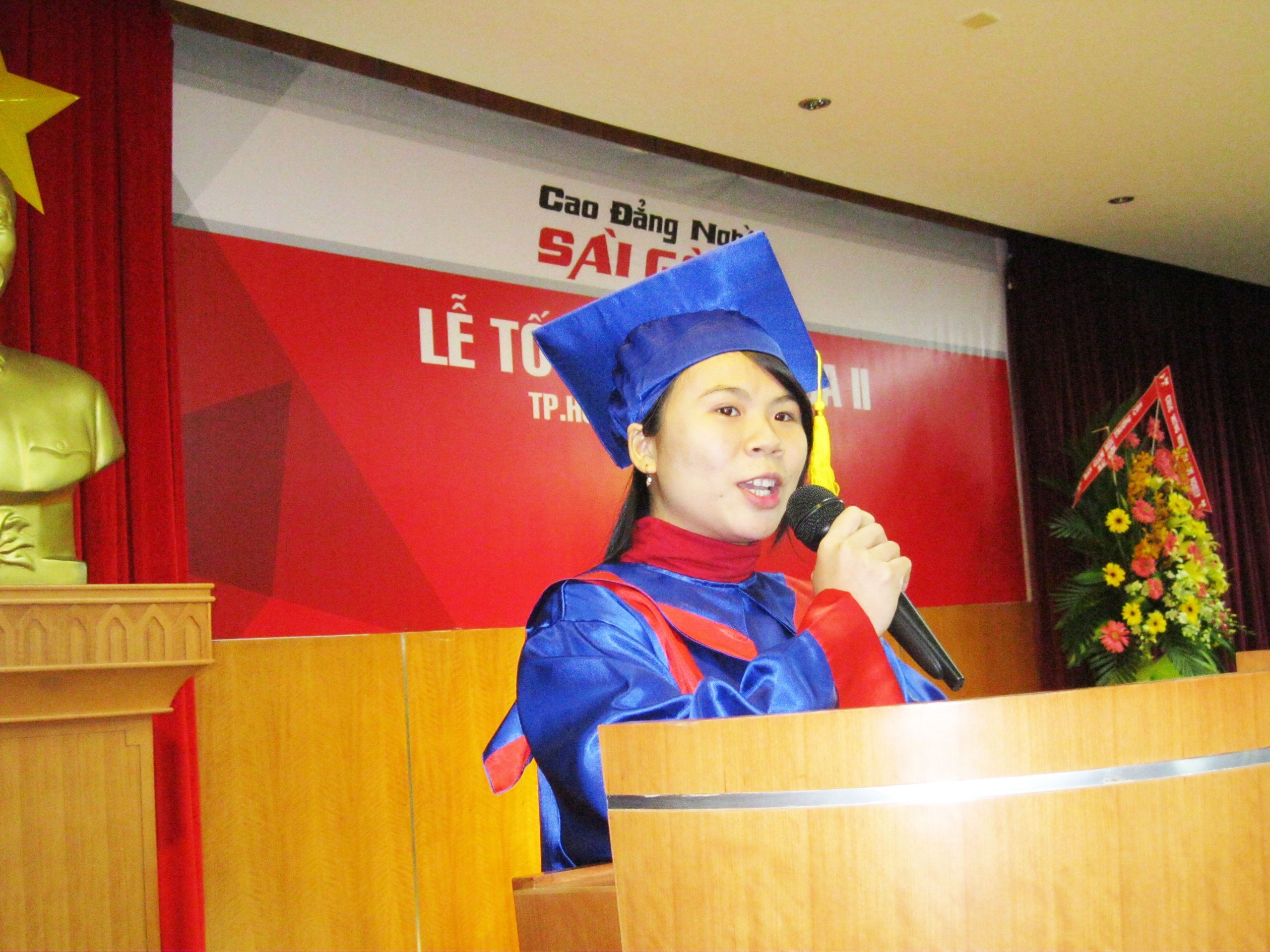 Thay mặt 70 tân cử nhân, sinh viên Nguyễn Thị Xiêm – ngành Kế toán phát biểu cảm tưởng và gửi lời cám ơn đến Ban Giám Hiệu nhà trường, Thầy cô, Cha mẹ và bạn bè đã luôn động viên giúp đỡ sinh viên hoàn thành tốt việc học tập. Bạn Xiêm chia sẻ: “…dù có đi đâu, về đâu, trong suy nghĩ của mình, chúng em sẽ luôn khắc cốt ghi tâm lời thầy cô dạy bảo, sẽ nỗ lực hết mình để chứng minh rằng những sinh viên tốt nghiệp của trường Cao đẳng Sài Gòn là những người hữu dụng. Đó là tâm nguyện và cũng chính là lời hứa của tất cả sinh viên khóa 2 chúng em trước quí vị đại biểu, quý thầy cô giáo trong không khí trang trọng của buổi Lễ Tốt Nghiệp hôm nay.”