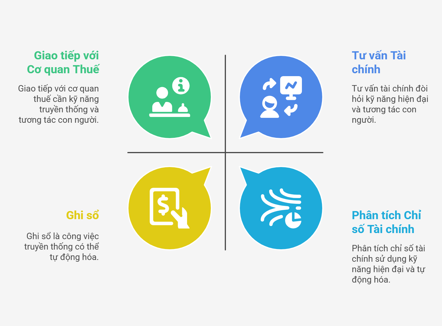 Nhờ vào công nghệ, các công việc mang tính lặp lại như hạch toán, tính lương, lập phiếu thu chi đang được phần mềm hỗ trợ ngày càng tốt hơn. Tuy nhiên, thay vì mất việc, kế toán được chuyển sang vai trò có giá trị hơn: kiểm tra – phân tích số liệu – tư vấn tài chính – dự báo rủi ro