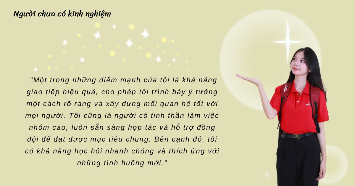 – Sinh viên mới ra trường: “Một trong những điểm mạnh của tôi là khả năng giao tiếp hiệu quả, cho phép tôi trình bày ý tưởng một cách rõ ràng và xây dựng mối quan hệ tốt với mọi người. Tôi cũng là người có tinh thần làm việc nhóm cao, luôn sẵn sàng hợp tác và hỗ trợ đồng đội để đạt được mục tiêu chung. Bên cạnh đó, tôi có khả năng học hỏi nhanh chóng và thích ứng với những tình huống mới.”