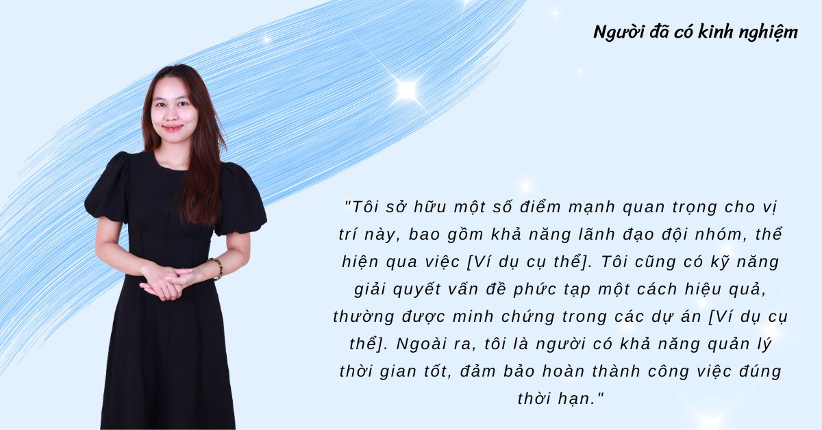– Người đã có kinh nghiệm: “Tôi sở hữu một số điểm mạnh quan trọng cho vị trí này, bao gồm khả năng lãnh đạo đội nhóm, thể hiện qua việc [Ví dụ cụ thể]. Tôi cũng có kỹ năng giải quyết vấn đề phức tạp một cách hiệu quả, thường được minh chứng trong các dự án [Ví dụ cụ thể]. Ngoài ra, tôi là người có khả năng quản lý thời gian tốt, đảm bảo hoàn thành công việc đúng thời hạn.”