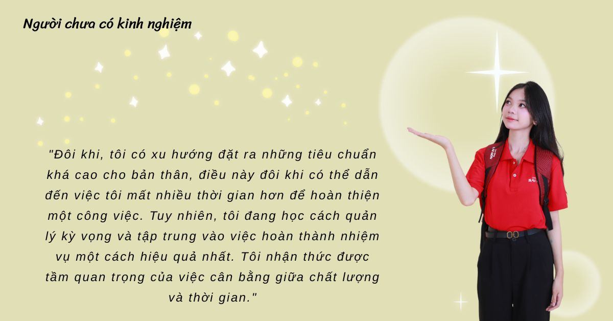 – Sinh viên mới ra trường: “Đôi khi, tôi có xu hướng đặt ra những tiêu chuẩn khá cao cho bản thân, điều này đôi khi có thể dẫn đến việc tôi mất nhiều thời gian hơn để hoàn thiện một công việc. Tuy nhiên, tôi đang học cách quản lý kỳ vọng và tập trung vào việc hoàn thành nhiệm vụ một cách hiệu quả nhất. Tôi nhận thức được tầm quan trọng của việc cân bằng giữa chất lượng và thời gian.”