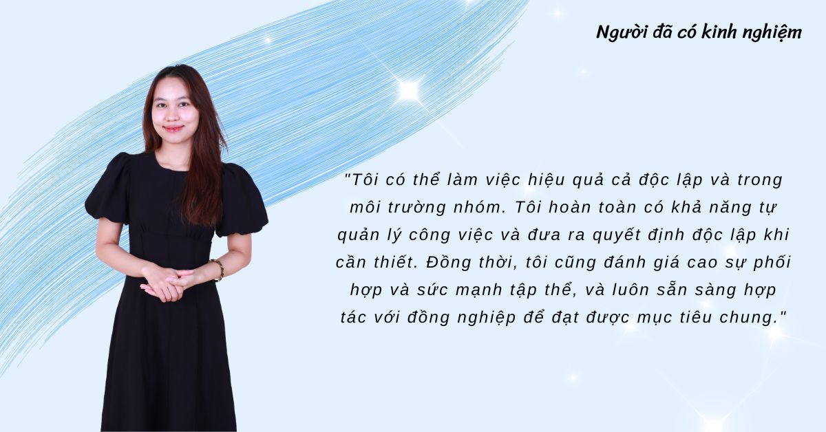 – Người đã có kinh nghiệm: “Tôi có thể làm việc hiệu quả cả độc lập và trong môi trường nhóm. Tôi hoàn toàn có khả năng tự quản lý công việc và đưa ra quyết định độc lập khi cần thiết. Đồng thời, tôi cũng đánh giá cao sự phối hợp và sức mạnh tập thể, và luôn sẵn sàng hợp tác với đồng nghiệp để đạt được mục tiêu chung.”