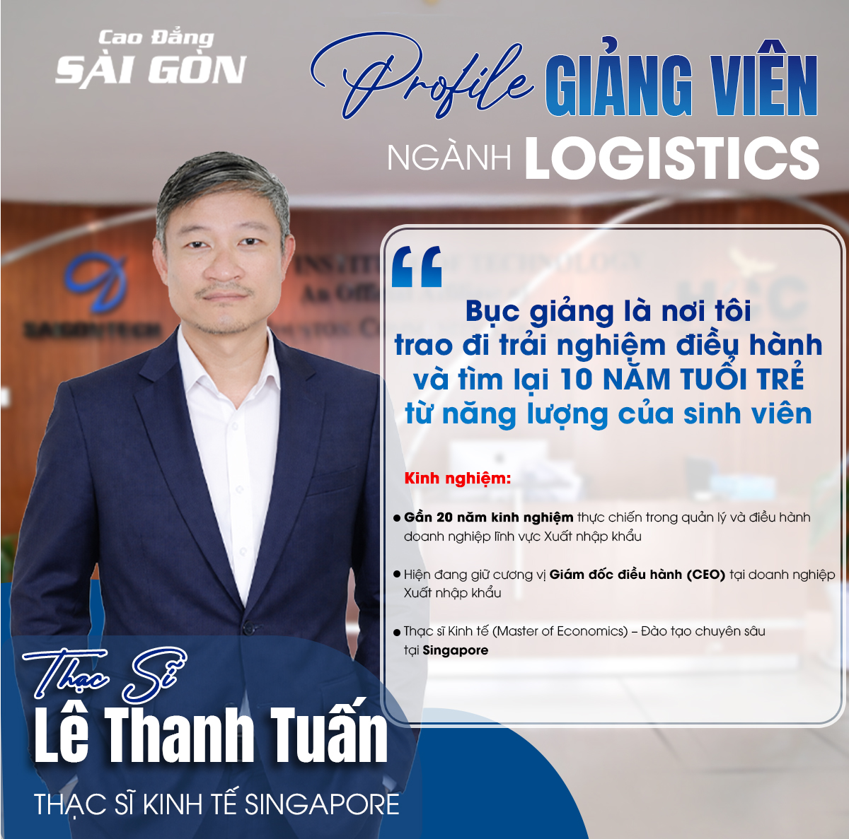 Thầy Lê Thanh Tuấn hiện đang giảng dạy ngành Logistics tại Trường Cao đẳng Sài Gòn. Thầy tốt nghiệp Đại học Bách Khoa TP.HCM và hoàn thành chương trình Thạc sĩ Kinh tế tại Singapore – nền tảng học thuật giúp thầy hình thành tư duy hệ thống, logic và chuẩn mực quốc tế trong quản trị.