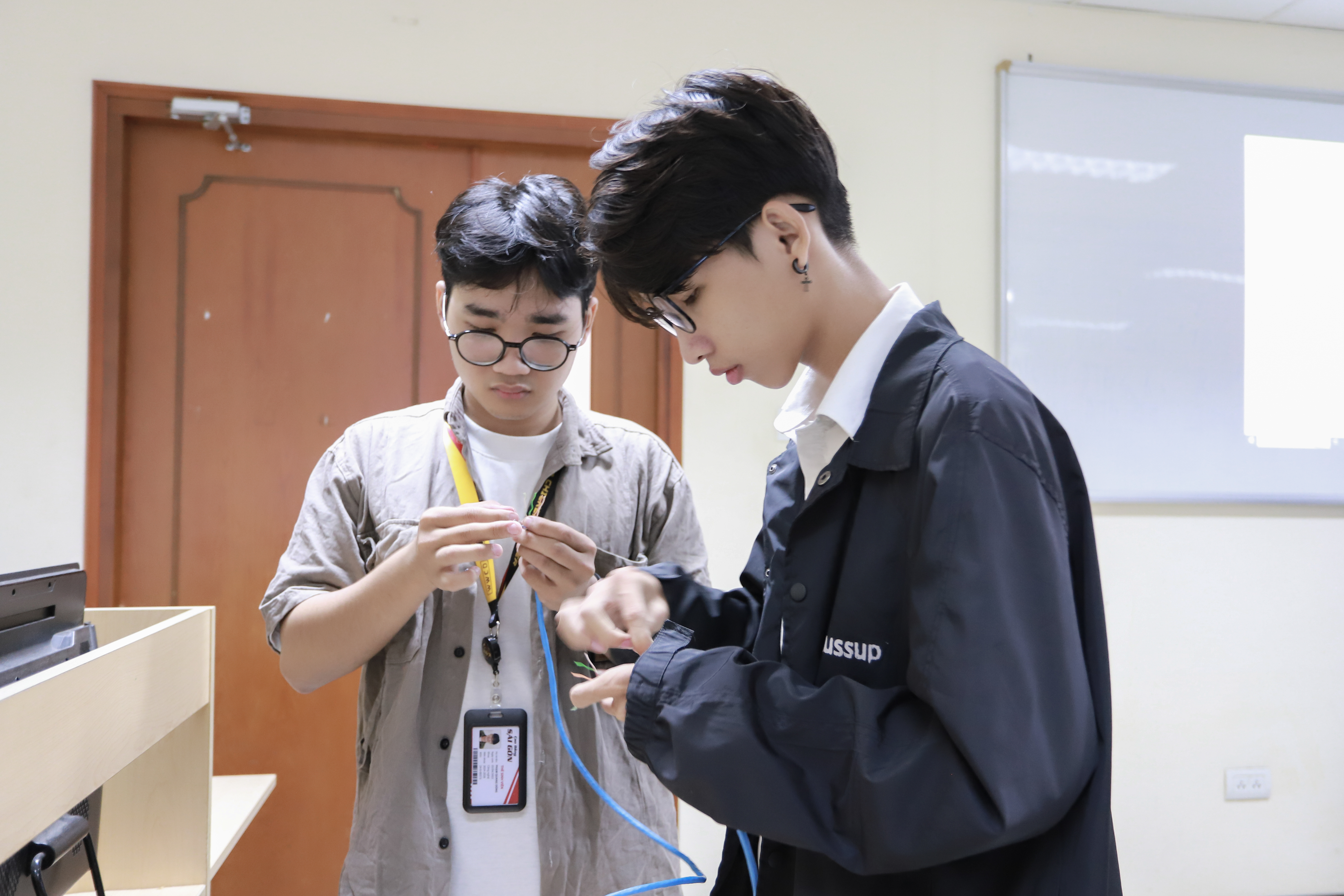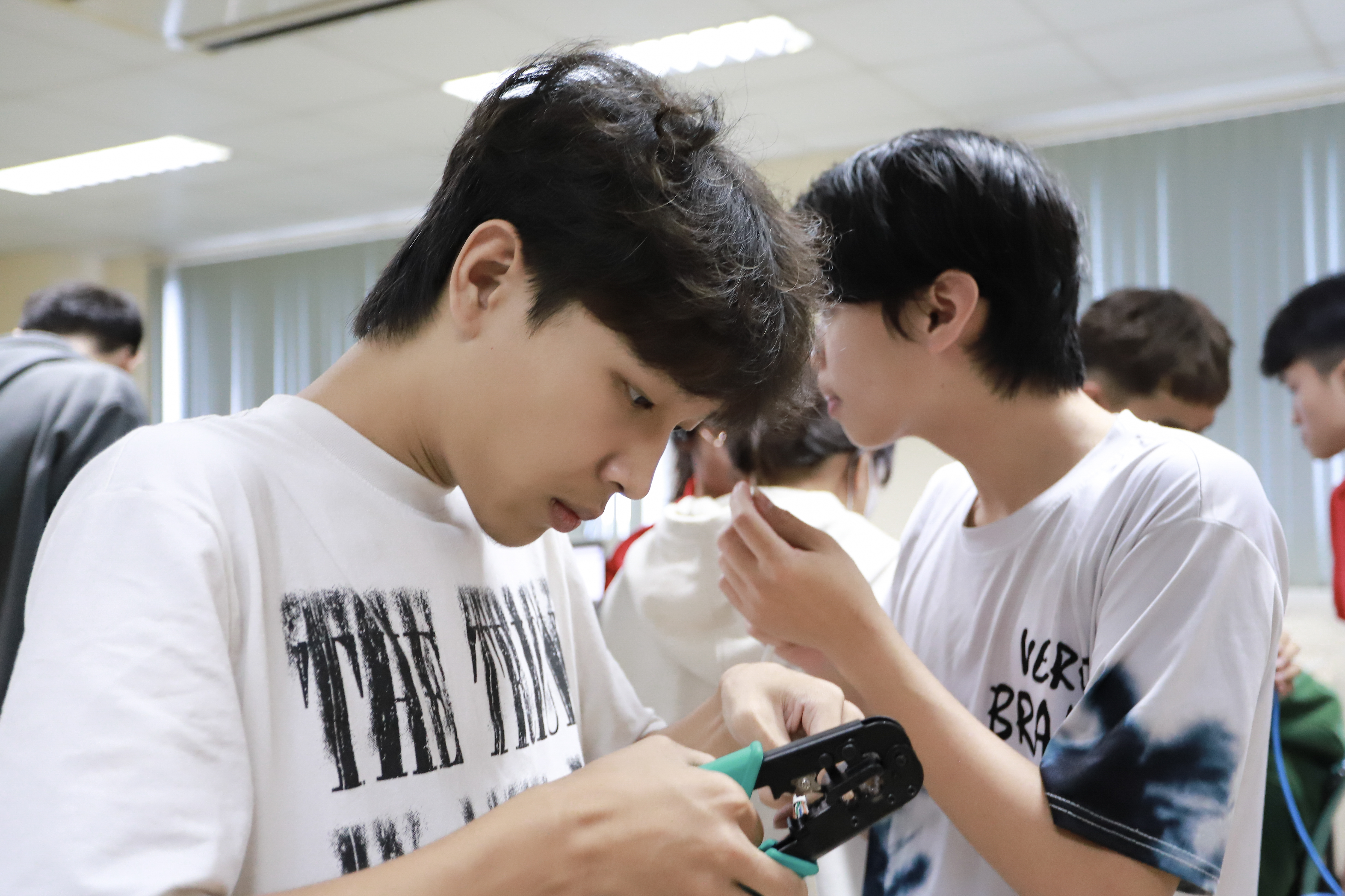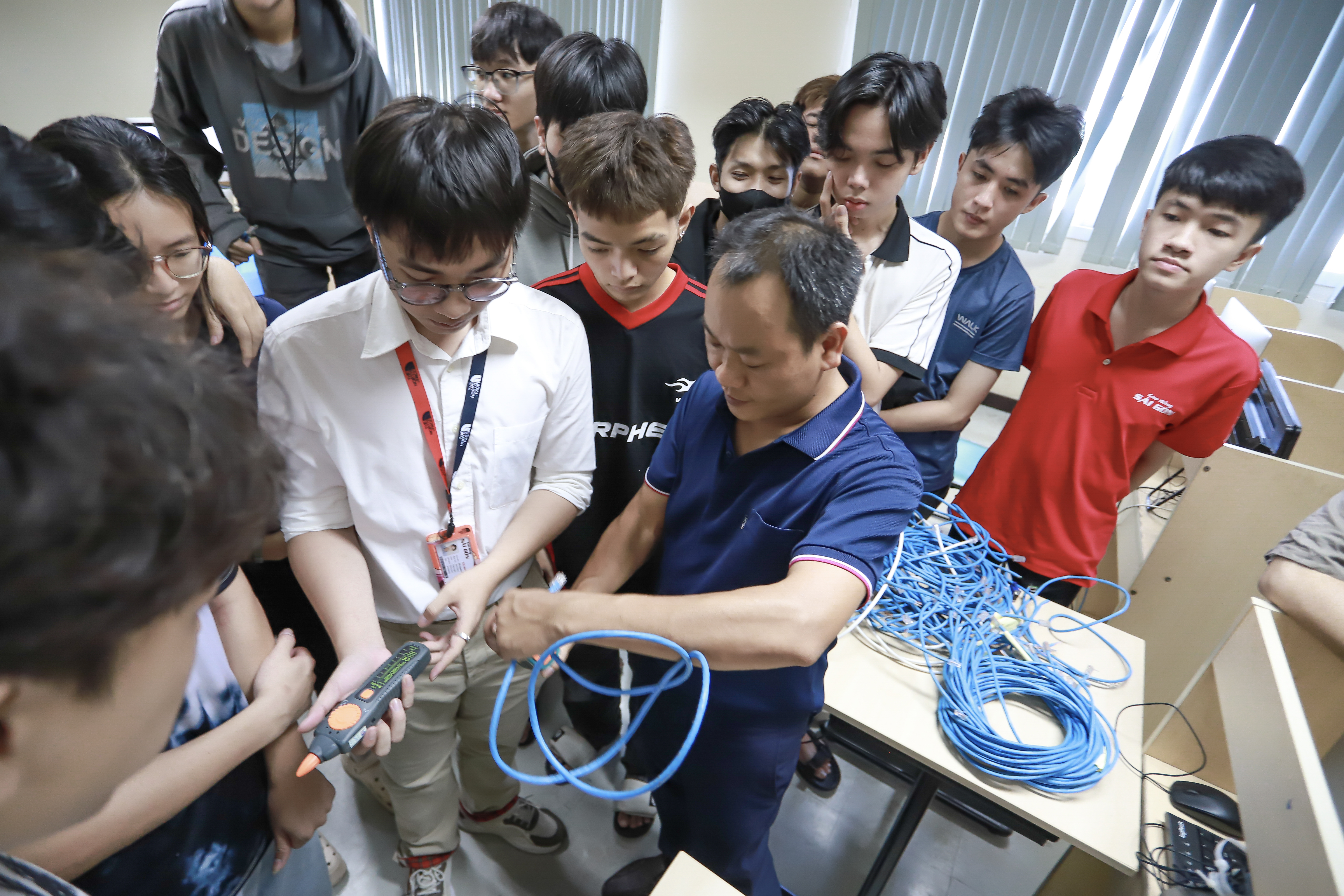 Các bạn sinh viên đang được giảng viên hướng dẫn cách bấm cáp thông minh và nhanh chóng