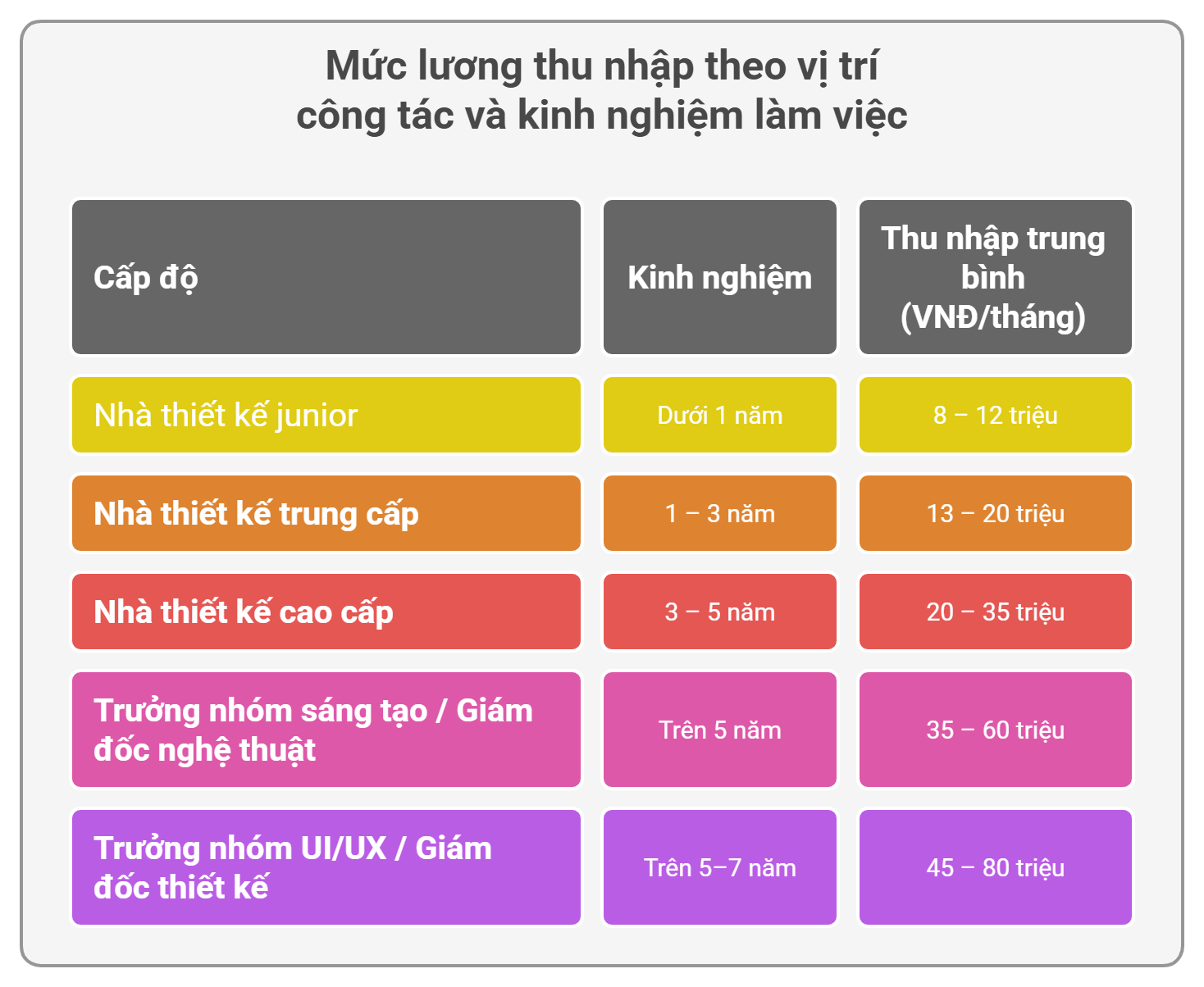 Dựa vào bảng trên có thể thấy, mức thu nhập ngành thiết kế đồ họa tăng đều theo kinh nghiệm và kỹ năng chuyên môn. Đây là ngành hiếm hoi cho phép bạn “leo thang lương” nhanh nếu liên tục nâng cao portfolio và bắt kịp xu hướng thị trường.